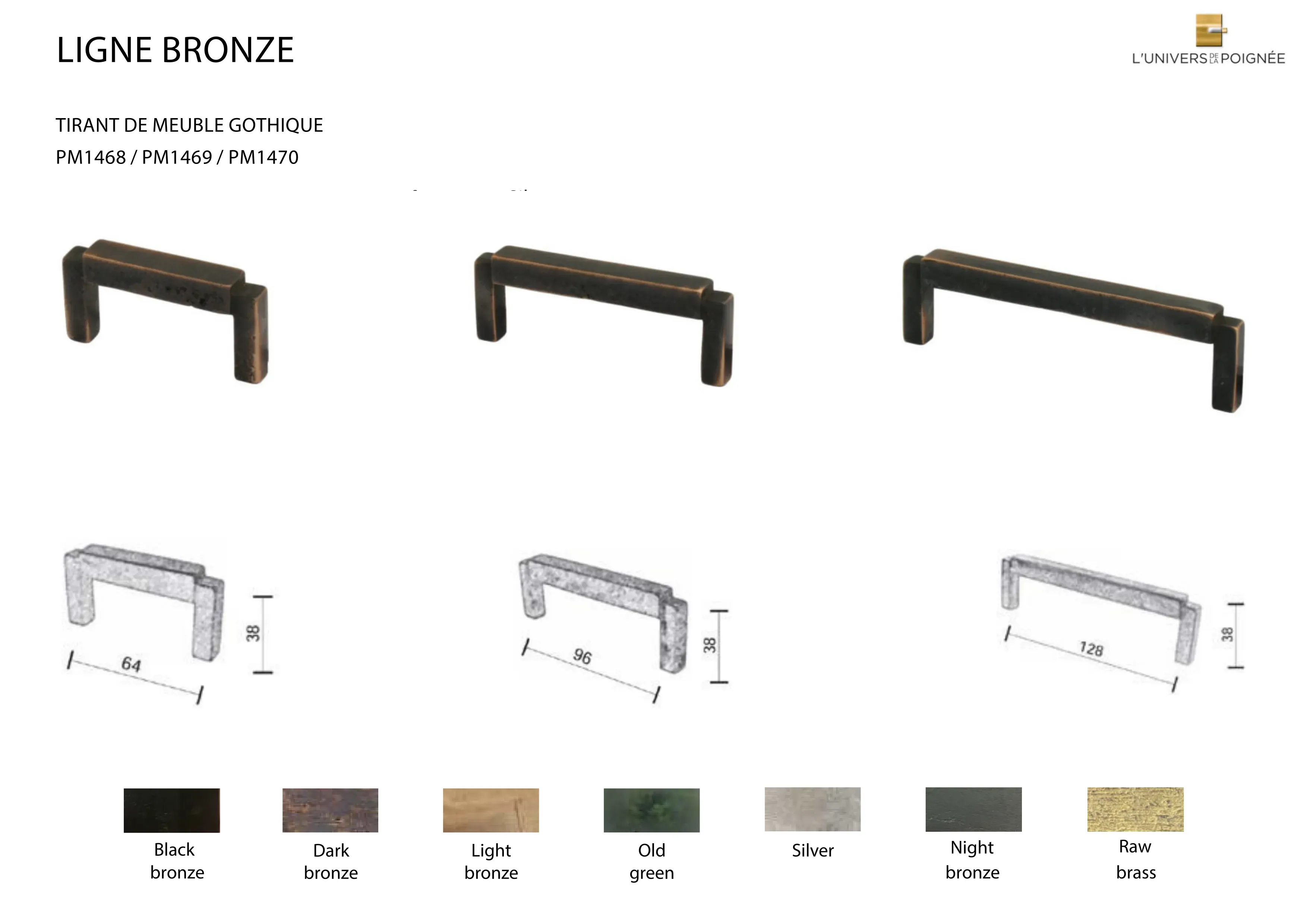 Les finitions disponibles incluent : Black bronze ; Dark Bronze ; Light Bronze ; Old Green ; Silver ; Night Bronze ; Old Brass ; Nickel Brillant