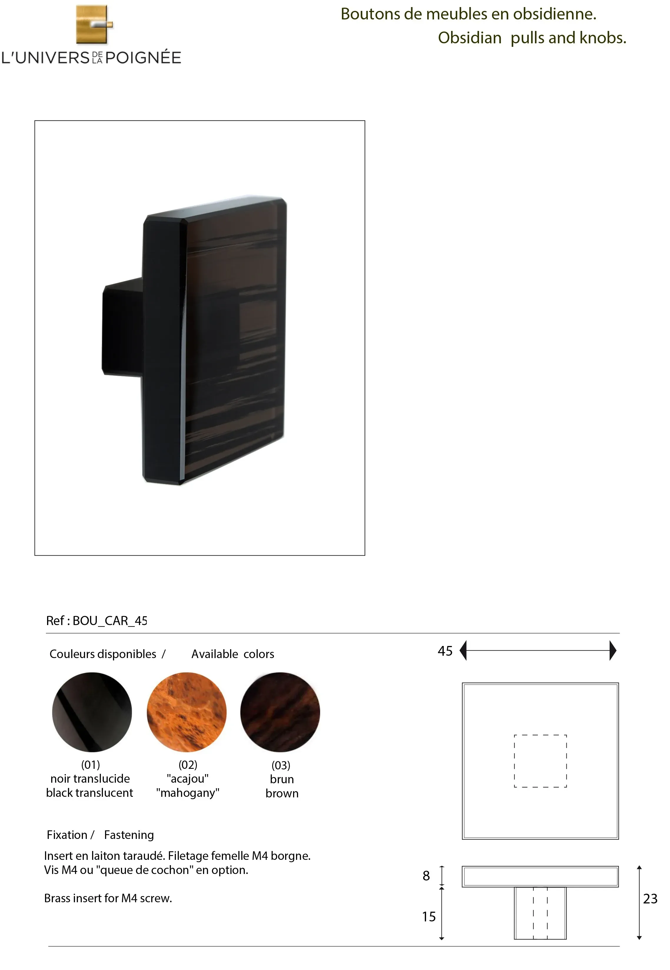 Disponibles en trois finitions selon les modèles – noir translucide, brun et acajou – ces poignées apportent une touche de caractère et d’élégance aux façades de placards et meubles. Leur surface lisse et brillante met en valeur la profondeur et les reflets naturels de la pierre, ajoutant une dimension sophistiquée et unique à chaque pièce.